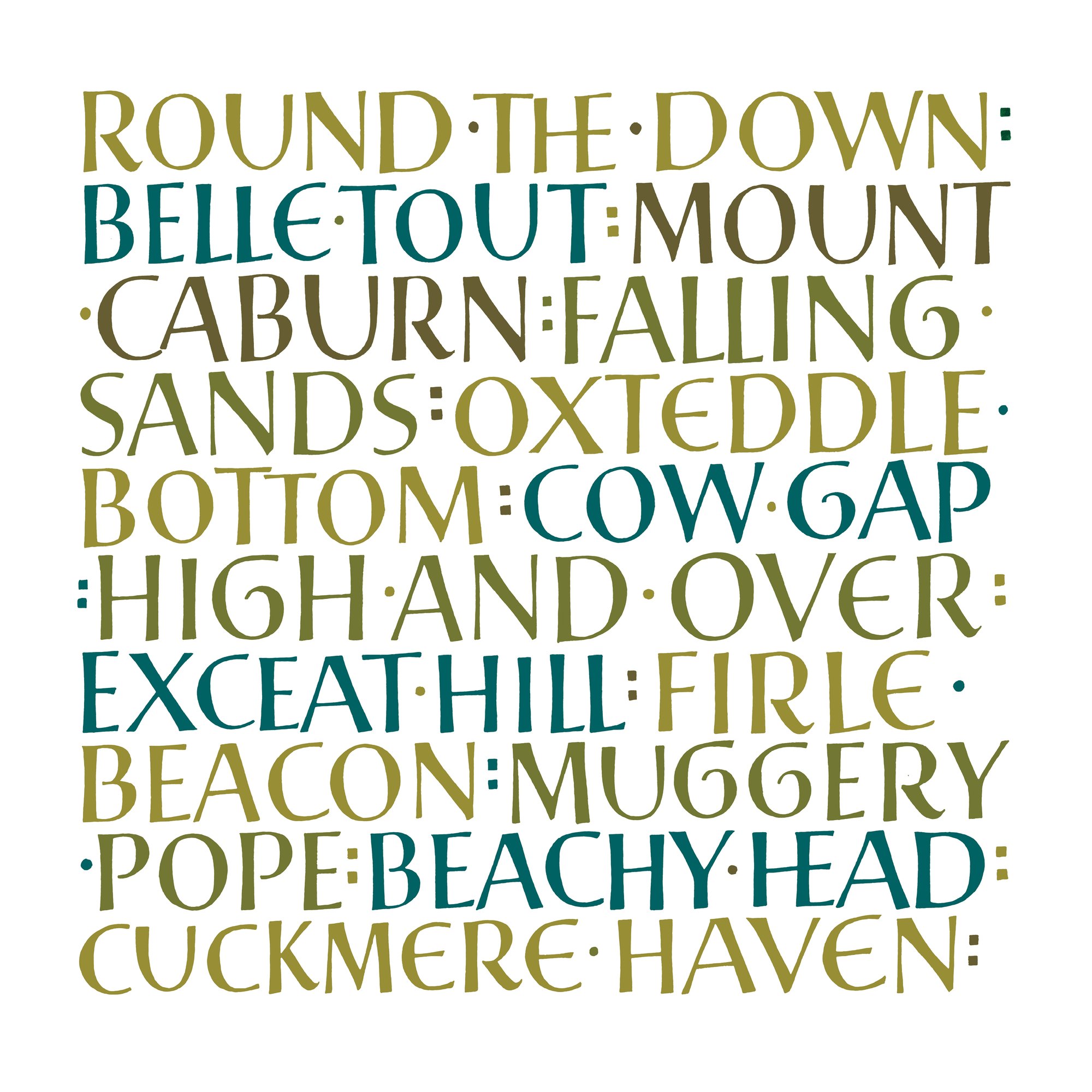 This Fine Art print celebrates places in the South Downs between Lewes and Eastbourne. These beautiful locations link to villages including Glynde, Firle, Alfriston, Seaford and Westdean.
